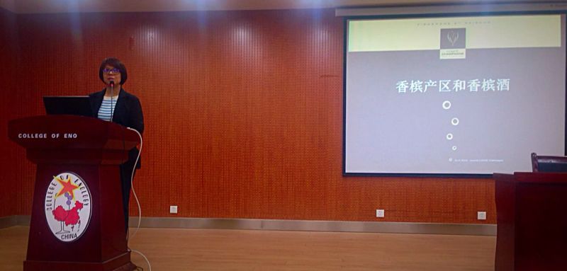 特地邀请了王蔚老师担任此次报告会以及品鉴会的主讲人,王蔚老师毕业于北京外国语大学法语系,法律博士,留学法国、爱尔兰。长期从事知识产权法律工作。2006年至今担任法国香槟酒协会中国首席代表。她对香槟的热爱与了解带领同学们从多方面深入了解香槟的故事。