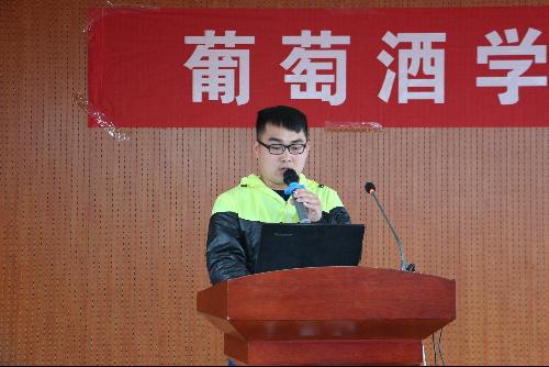毕业生沙青的实习地点是德国的克林根堡酒庄,首先,他向大家介绍了克林根堡酒庄的地理位置和附近的优美景色,生动详实的PPT向我们再现了那里的风土人情。国外的生活也不是像大家想的那么优越,几十平米的房屋,狭窄的厨房,简单的饭菜,寒冷的天气,不过,最重要的是,一次实习让他对国外的酒庄和相关工作者有了更多的了解。添桶、打循环、垦地、加硫等工作均已亲身体验,有时也可能一整天都在重复的开瓶塞。“酒窖管理”方面的主要学习也使他对国外酒庄的工作机制和方式有了更多的了解。
