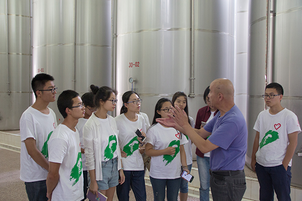 从山上回到酒庄,质检科钟科长热心的带我们参观了酿酒车间。车间采用自然重力法对葡萄进行加工。得益于优越的葡萄质量,整个酿造过程无需过多的人为处理,就能得风味独特的上好葡萄酒。