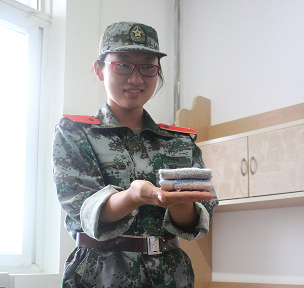 各宿舍长在之前已经接受了教官事无巨细的内务培训,并且用本子记录了内务整理的注意事项,用手机拍下了标准宿舍的样式。我院每个宿舍的小葡萄都在各自舍长的带领下井然有序的整理着。枕头、被子、军装在床上各居其位、立定站好,拖鞋、便鞋、脸盆在床下向右看齐排列成行。床单平整如无波水面,桌面整洁如戈壁沙滩。扫地、擦地、叠被子、摆水壶,小葡萄们互帮互助,忙的不亦乐乎。大家都在努力为自己和室友创造着更整洁、更舒适、更有军队作风的生活环境。
