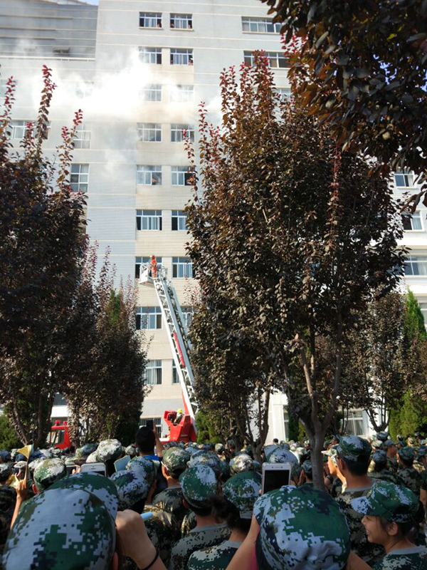 的学生成功从八号楼安全撤离,尽管人员众多,但每位同学都十分镇定,未发生任何踩踏事故。为加强此次演习的教育力度,我校还邀请了杨陵区消防大队的官兵为同学们进行了生动精彩的消防救援演练。当云梯伸向被困人员,当水枪喷向高处楼层,当义无反顾的消防员冲向大楼,同学们意识到与火魔的斗争是激烈而又必须争取胜利的,因为生命最为宝贵。“消防员是与火魔战斗,守护人民生命的钢铁长城!”同学们不禁如此感叹道。