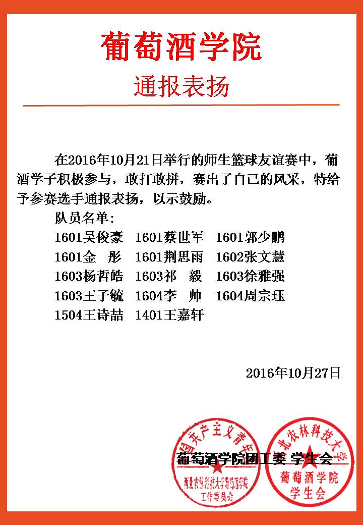 葡酒团〔2016〕34号 通报表扬