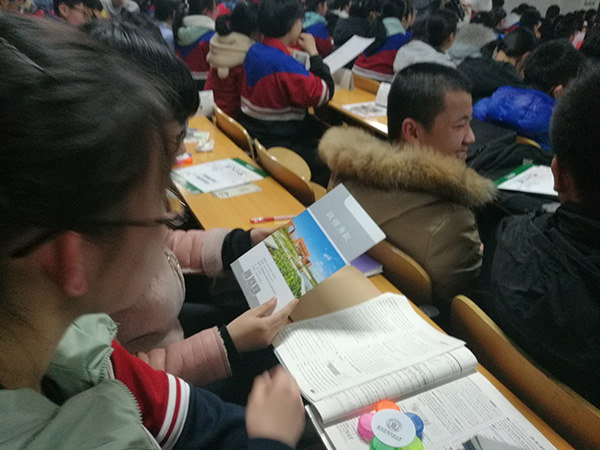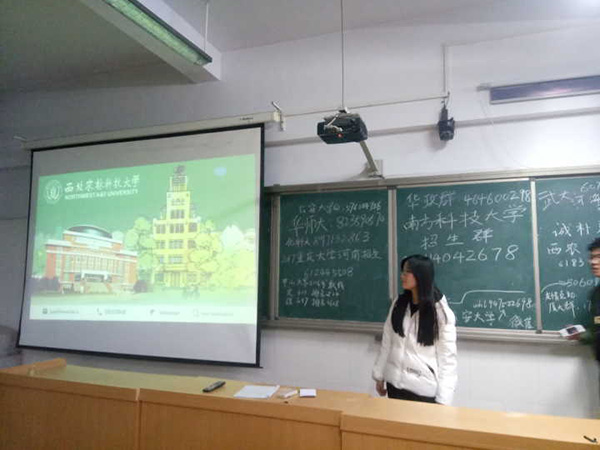 宣讲开始前,高三学弟学妹的热情就震动了我,几百人进入阶梯教室,几乎将教室挤满了。宣讲开始,我们通过向学弟学妹们展示及讲解PPT的方式,全面介绍我校。我们从学校的历史开始讲起,介绍我校的大楼,大师级以及大爱,让同学们充分感受到我校的人文情怀。同时,我们向学弟学妹们介绍了学校的招生政策,近几年在河南的招生分数,让学弟学妹们更清晰地明白自己的目标。我们又向学弟学妹们展示了我校丰富的课余生活,社团活动与美丽的校园景色。最后,我们给学弟学妹们送了来自西农的小纪念品以及宣传册,让同学们再一次感受西农对学生的关怀。