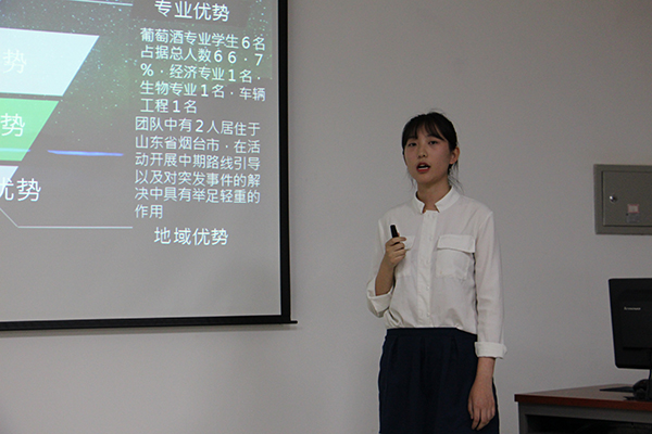 此次答辩中,所有团队的项目内容均为酒庄调研,具体包括葡萄酒产业的发展状况、葡萄酒的品牌建设、酒庄的发展形势及其品牌推广模式等方面。去往地点包括山东、云南、甘肃、河北、宁夏等不同省市。答辩队伍通过讲解PPT的形式,从活动思路、活动内容、前期准备、活动可行性、预期成果等方面进行汇报。评委老师结合答辩汇报情况就项目可实施性、经费预算等方面进行提问,并给出指导意见。在评委老师与选手的对答环节中,选手们进一步整理思路,发现自己的不足和需要改进的方面,不断完善。进过两个多小时的答辩,本次答辩会圆满结束。