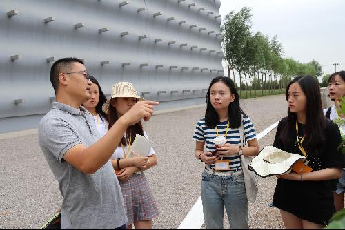 进入参观区,入眼是一面独具特色的墙壁。波浪形的灰色墙壁上嵌入了一根根小石桩,旁边是一面土黄色的墙壁。酒庄负责人告诉队员们,这面墙是冬天葡萄园的写照:银川的冬天少雨寒冷,需要把葡萄藤埋到土里以避寒冬;另外,一灰一黄两面墙壁,也寓意着酒庄的明天更加辉煌。