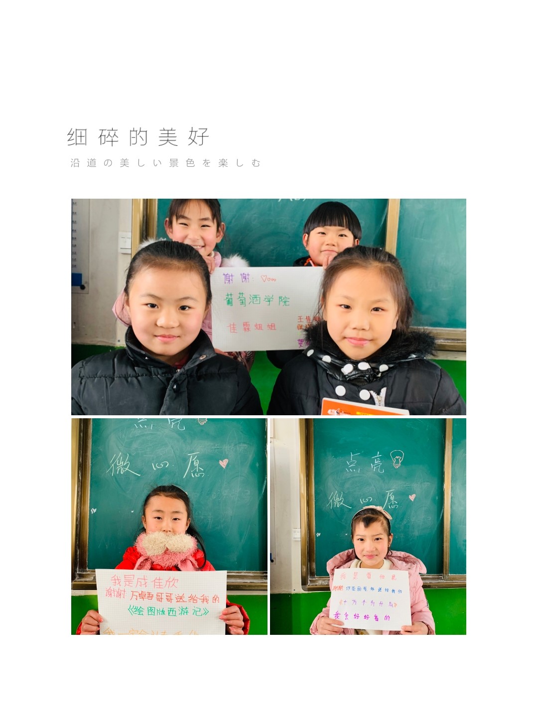 同学们都怀有一颗感恩的心,在得到自己梦寐以求的礼物后,纷纷拿起笔表达了对哥哥姐姐的感谢,并表示一定会好好珍惜。小美女雷怡晨在收到邓亚丽老师送给她的《十万个为什么》后,激动的说:“我一定会好好看邓亚丽老师送给我的书,我也会好好学习,以后有能力了我也会去帮助那些需要帮助的人的。”淳朴的话语却传出了无限的真情。