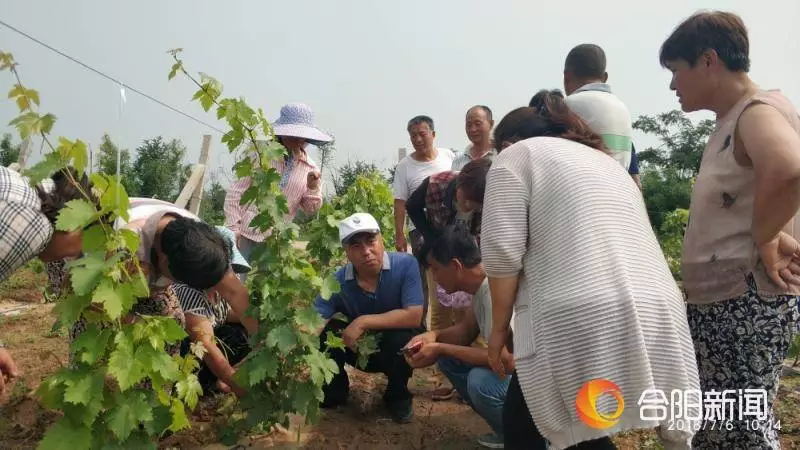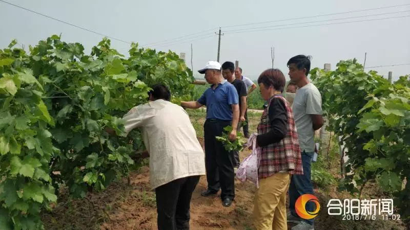 7月5日,天刚一放晴张宗勤教授就及时赶到合阳葡萄试验示范站做好下地准备,7月6日,经过一天太阳暴晒的地面已经能承受脚底板的压力,一大早张宗勤教授就赶到丰阜园区查看病害指导防治;接着又马不停蹄的赶到乾落村扶贫产业园,分别查看老园子、挂果幼树、新栽幼树的病害情况,在经过一翻仔细查看,与果农讨论交流后,张宗勤教授给出了病害防治的紧急措施: