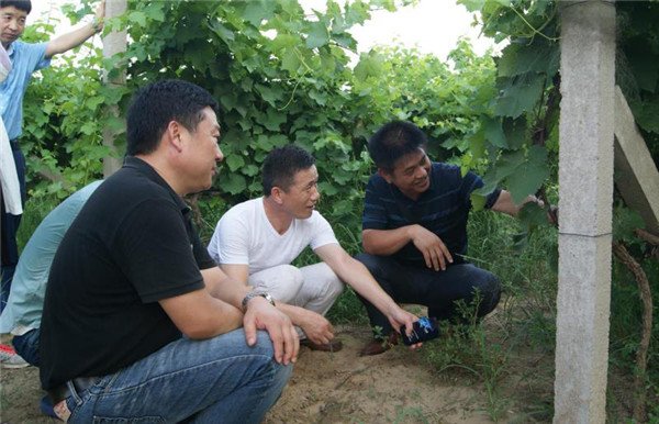 在民权县工信局局长王炜冲、民权县高新区副主任李国栋、天明民权公司总经理朱和平的陪同下,房玉林一行深入到天明民权位于野岗乡胡庄村的葡萄种植基地,仔细观察葡萄长势,对酿酒葡萄品种威代尔的果穗、糖度、酸度的良好表现给予称赞,并结合黄河故道产区的土质、气候特征就葡萄架势、剪枝的管理提出了良好的建议和指导。