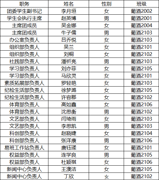 换届工作领导小组研究决定,现将2022-2023学年团委学生会干部名单公示如下:
