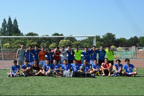 下半场所有人混合起来重新分成两队,大四毕业生学长和学弟们并肩战斗,充分体现了大家的团结、拼搏的精神,比赛更加精彩,进攻火力也更猛。长传冲吊、短传渗透和精彩配合比比皆是。最终比赛比分定格在6:5,所有参赛队员合影留念。