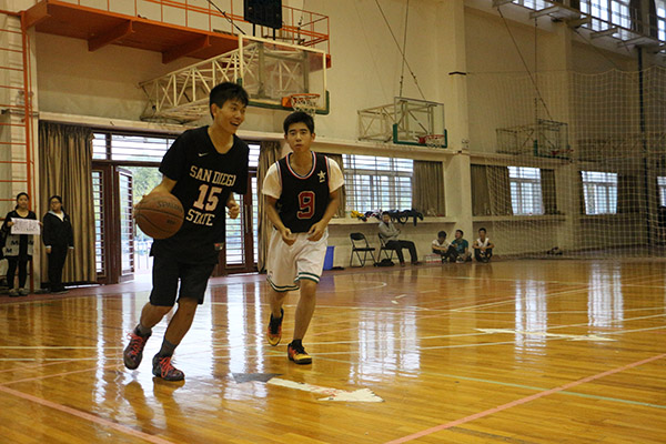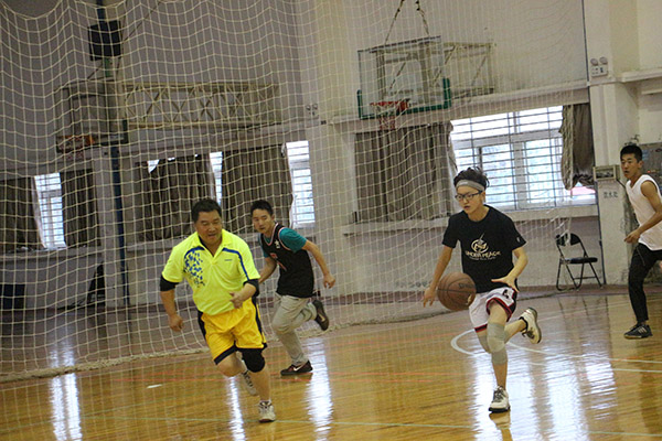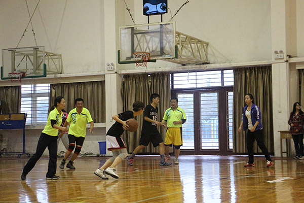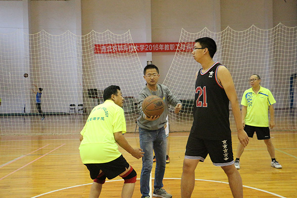 于篮球馆举行了师生篮球友谊赛。随着裁判的一声哨响,教师代表队和学生代表队展开了激烈的角逐。