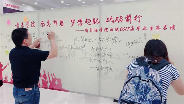 、感念师恩、梦想起航、砥砺前行”为主题的欢送毕业生签名墙,同学们的感恩之情和老师们的美好祝愿,都化作了签名墙上动情的话语。“甲贵爸爸”、“和财爷爷”、“继红妈咪”这样的昵称,体现了学生对老师的认可和爱戴,“感谢全院老师的栽培,么么哒!”、“牢记教诲,老师保重!”、“出航四海,69书吧