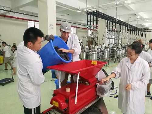 在葡萄酒酿造过程中,同学们不怕辛苦、任劳任怨,在中试规模上,对9个红、白酿酒葡萄品种,进行了分拣、原料成分分析、破碎除梗、发酵监控、澄清、压榨、发酵罐维护等操作,依据葡萄品种差异,出色地制定并完成了各具特色的酿造工艺。