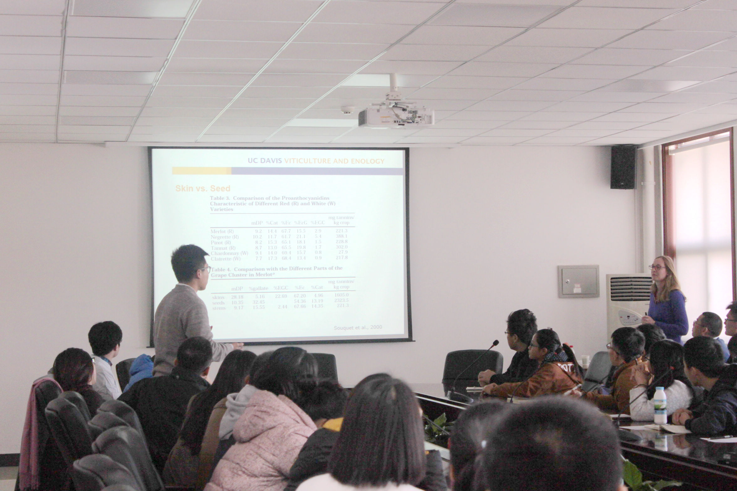 11月20日至11月23日,Watrelot博士在我院刘旭副教授实验室,对葡萄与葡萄酒中缩合单宁特性及其测定等方面就进行了指导和交流。23日下午,Watrelot博士为我院师生做了题为“Red Wine Mouthfeel Perception”的学术报告,深入浅出地介绍了葡萄酒中单宁特性对葡萄酒口感的影响机制及检测方法。69书吧