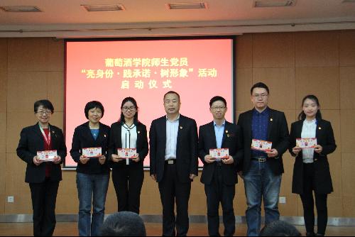 党委委员为各党支部负责人颁发“共产党员示范岗”桌牌,各党支部负责人为支部党员代表佩戴党徽。大会还组织各学生党员签署了“亮身份,践承诺,树形象”主题实践活动承诺书。党委书记胡俊鹏带领全体党员重温入党誓词。
