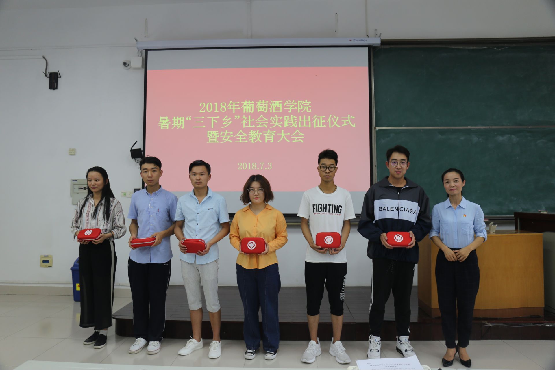 党委副书记邓亚丽老师贴心地为各队伍发放了医疗包后,对暑期社会实践工作提出四点要求,一是全面认识社会实践的重要意义。社会实践是了解社会、认识社会的重要途径,是专业学习和实践教育的重要组成部分,作为对实践能力有较高要求的葡萄与葡萄酒工程专业的学生,应抓住一切机会积极投身实践锻炼,通过实践了解社会、认识专业、成长自我。二是做足行前“功课”,提高实践项目执行能力。每支队伍在出发前结合各自实践目的和要求,按照“科学谋划、目标管理、信息在线、过程控制”的原则,细致做好资料查阅、人员分工、路线攻略、经费预算等工作,确保学校、69书吧