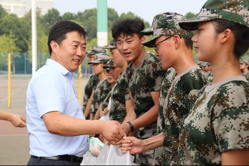 党委书记胡俊鹏、院长房玉林和党委副书记邓亚丽在辅导员的带领下来到训练场地,亲切的慰问了我院参加军训的2018级全体学生和教官。