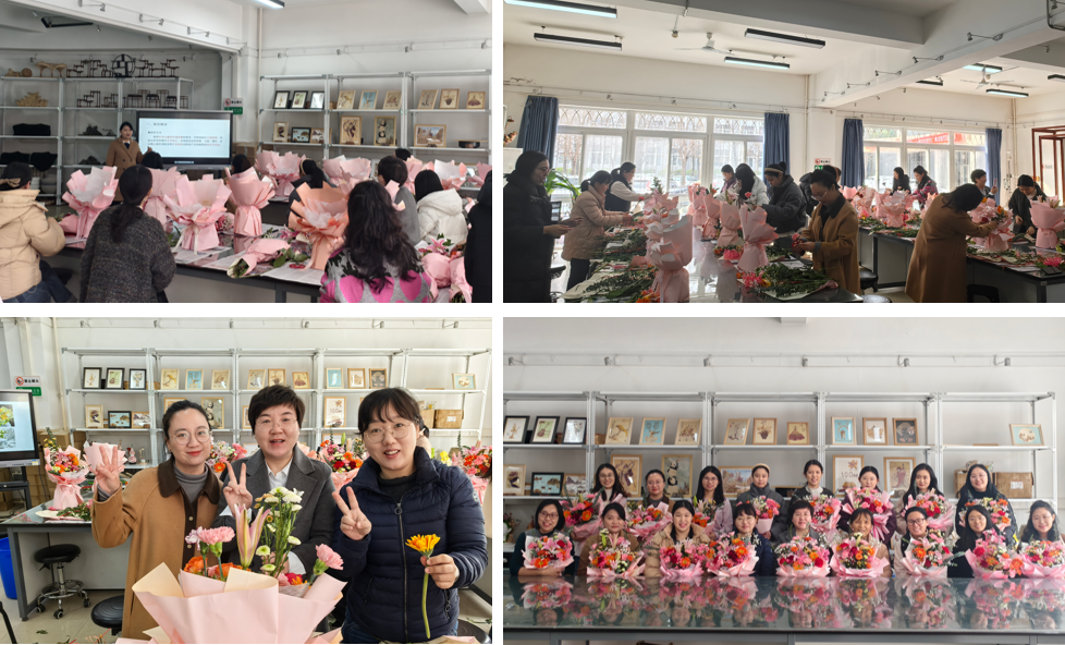 副教授史倩倩进行授课指导,共赴春日花事。史老师从花材选择、色彩搭配、插花技巧等方面进行了详细讲解,并现场演示了多种插花造型。女教职工们充分发挥想象力和创造力,将一朵朵鲜花精心搭配,创作出一束束独具匠心的插花作品。活动现场花香四溢,欢声笑语不断,大家沉浸在创作的乐趣中,感受着春天的气息和节日的喜悦。