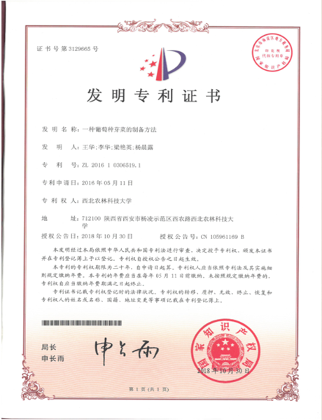 获得1项由中华人民共和国知识产权局颁发的《发明专利证书》。发明名称:《一种葡萄种芽菜的制备方法》,发明人:王华;李华;梁艳英;杨晨露,专利证书号:第3129665号,专利号:ZL 2016 1 0306519.1。