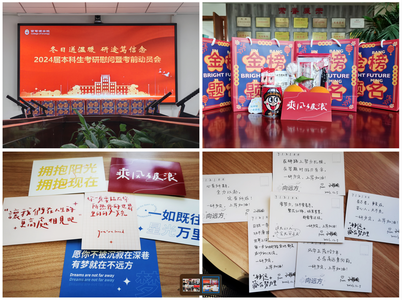 高度重视2024届毕业生的升学工作,通过举办考研经验分享会、开设暑期考研专项特训班、前置校外生产实习、提供考研信息服务、加强考研心理辅导等系列举措,积极为学生备考创造有利条件、开展精准帮扶,提供暖心服务。“追风赶月莫停留,平芜尽处是春山。”祝愿所有葡酒学子锚定目标、争分夺秒、坚定信心,迎难而上,圆梦情校,一战成“硕”!