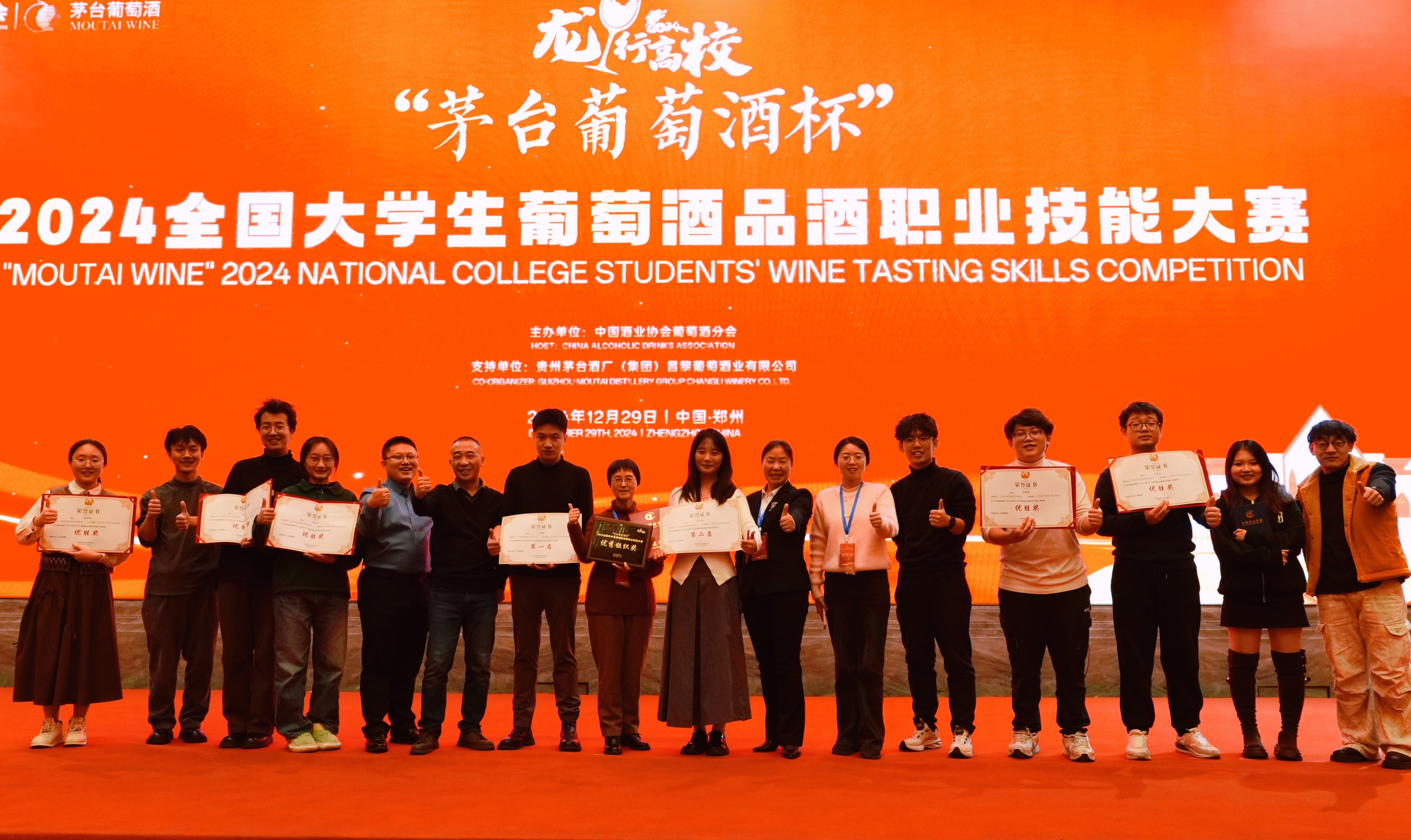 12月29日,在河南省郑州市举办的“茅台葡萄酒杯”2024全国大学生葡萄酒品酒职业技能大赛总决赛中,我院参赛队伍10名参赛学生有7人进入前15名,其中研究生丁维康同学荣获冠军、本科生李佳柔同学荣获亚军,学校获“优秀组织奖”。